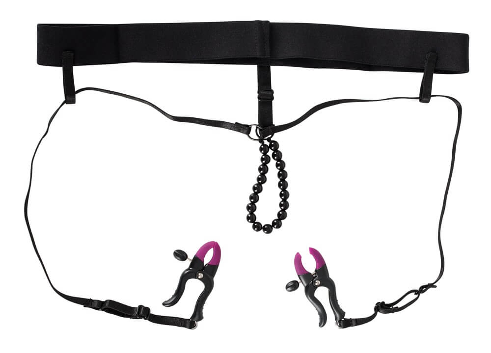 Pre ešte hlbšie a intenzívnejšie vniknutie sú tu klipsy na klitoris s nastaviteľnými popruhmi v čiernej farbe s umelými perlami.