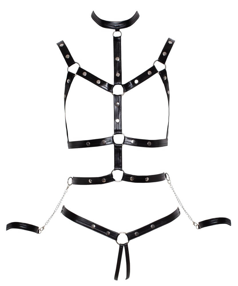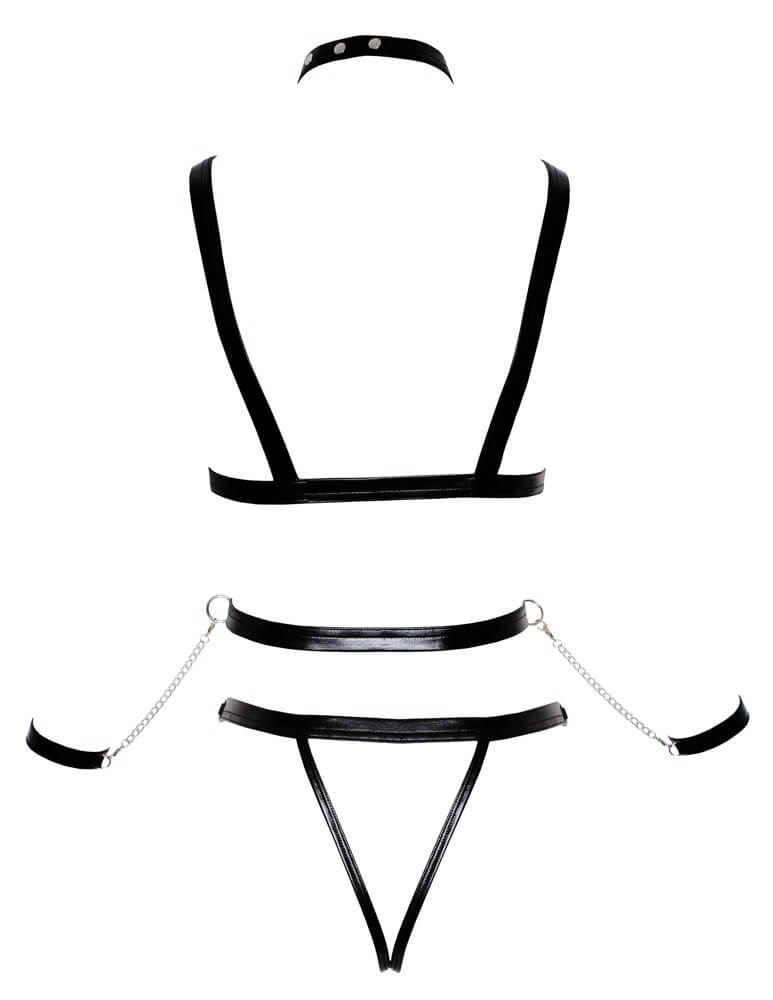 Otvorená spodná bielizeň z pružných pásikov zvýrazní krivky a ponechá intímne oblasti odhalené. Pásiky sú spojené kovovými krúžkami a zdobené nitmi.