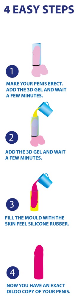 Sada obsahuje : formičku (balenie slúži ako forma), remienok na penis, návlek, fľaštičku s tužidlom, 3D gél na vytvorenie repliky, silikónovú gumu, 1 pár plastových rukavíc, drevenú špachtľu a podrobný návod (D, NL, FR, GB).