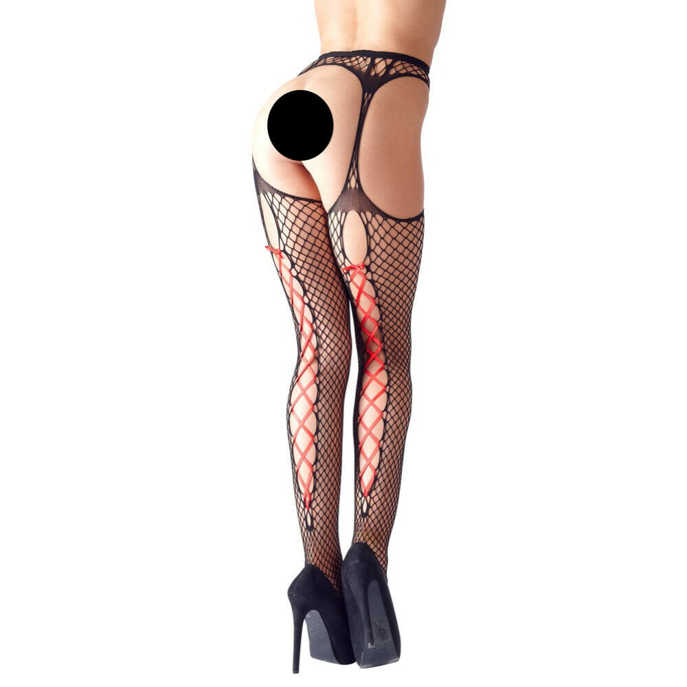 1× sieťované podväzkové (suspender) pančuchy s červeným šnurovaním.
