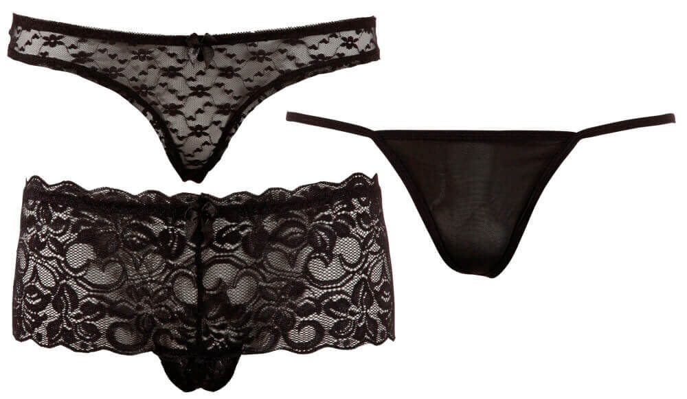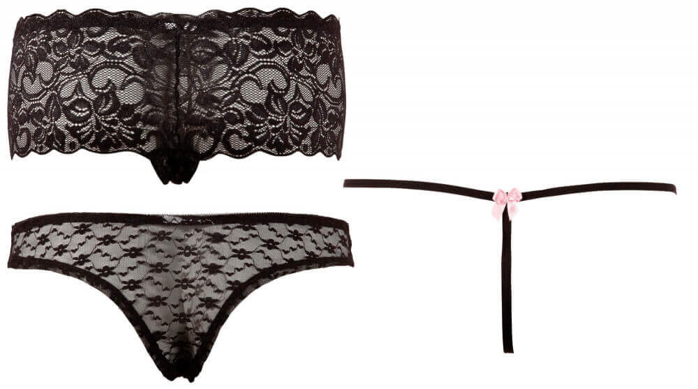 Výber zmyselnej dámskej bielizne na každú príležitosť!Súprava obsahuje:-1 ks francúzske nohavičky z priesvitnej čipky, bohato zdobenej motívmi-1 ks dámske nohavičky z priesvitnej, mäkkej kvietkovanej čipky-1 ks tangá v tvare do T s priesvitnej sieťoviny s drobnými okami, s pružnými pántami, vzadu zdobené malou, ružovou mašličkouMateriál: 94% polyamid,... Viac info