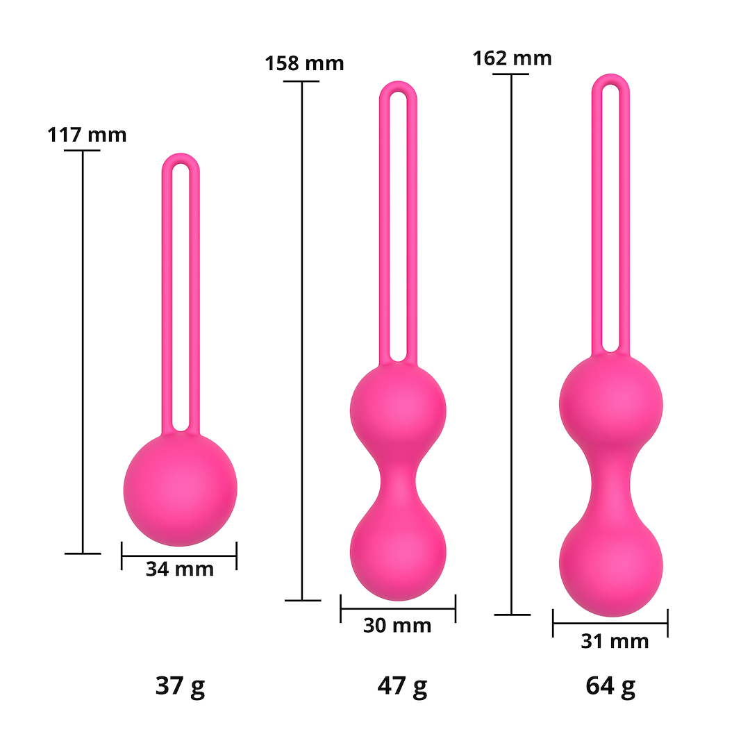 Naša sada 3 gejšových loptičiek z kolekcie Sweet Play je navrhnutá tak, aby poskytovala komplexný tréning Kegelových svalov, ktorý pomáha udržiavať ich silu. Pravidelné cvičenie s loptičkami má pozitívny vplyv na vaginálne zdravie a pomáha predchádzať problémom, ako je inkontinencia moču. Posilnené Kegelove svaly môžu výrazne zlepšiť sexuálne pocity a zvýšiť intenzitu orgazmu. Lopty majú rôznu hmotnosť, čo vám umožňuje postupne zvyšovať intenzitu tréningu a prispôsobovať ho vašim potrebám. Používanie loptičiek môže tiež poskytnúť potešenie podobné ako pri klasickom vibrátore a zároveň ponúka zdravotné aj sexuálne výhody.