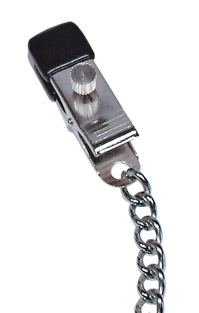 Impozantná reťaz so svorkami na bradavky! Ak obľubujete extrémne rozkoše a nežnú bolesť, potom táto kovová retiazka na bradavky nemôže chýbať z Vašej zbierky. Špeciálne, pogumované štipce s nastaviteľnou silou tlaku. Dĺžka každého štipca cca. 5,5 cm, šírka 1,5 cm. Hmotnosť reťaze cca. 70 g. Materiál: kov (neobsahuje alergény). Viac info