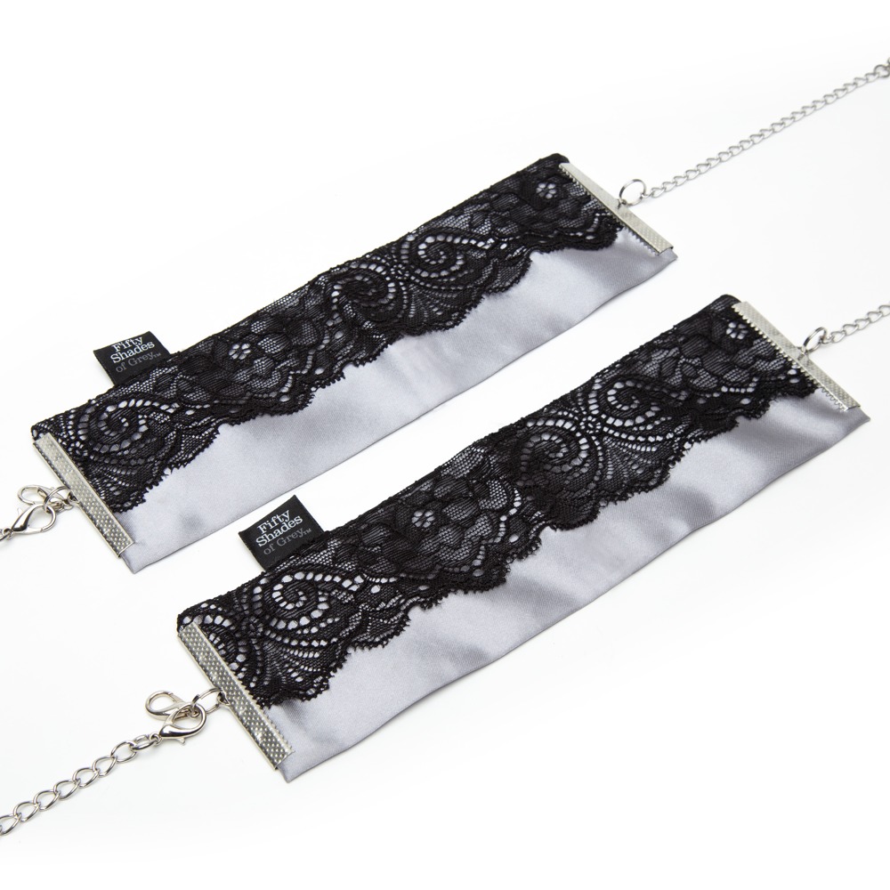 Pár zmyselných saténových pút striebornej farby s jemnými ozdobami z čiernej čipky.