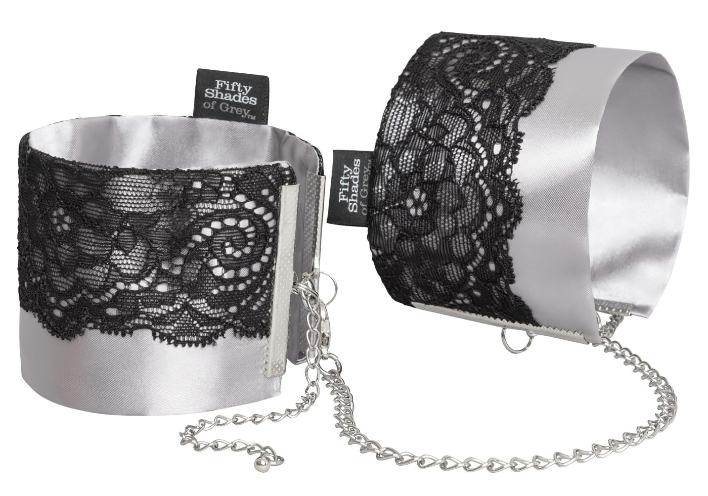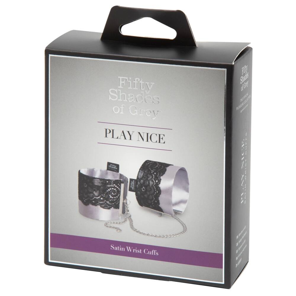Fifty Shades of Grey Play Nice - saténové putá (čierne-strieborné) Ďalší člen série Fifty Shades of Grey sa chce pridať do vašej zbierky!Pár zmyselných saténových pút striebornej farby s jemnými ozdobami z čiernej čipky. Obmedzte pohyby svojho partnera, urobte ho úplne zraniteľným voči vašim túžbam! Je vyrobený z vysoko kvalitných materiálov a má originálne... Viac info