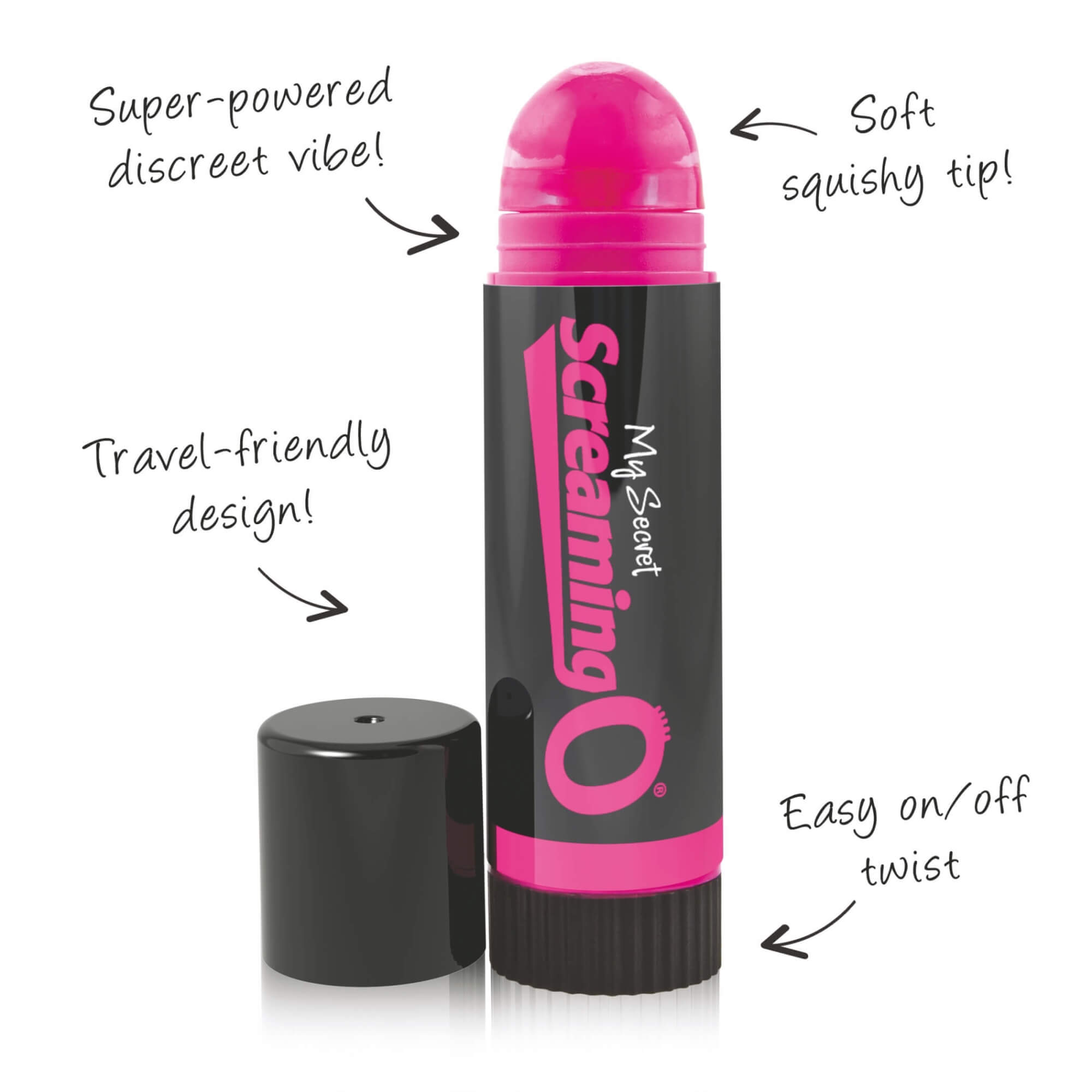 My Secret Screaming O Vibrating Lip Balm – vibrátor v tvare rúžu (pink-čierny) Screaming Lip Balm - tajný milenec v tvare rúžového vibrátora, ktorý sa nenápadne ukrýva v ženskej kabelke, veď sa zamaskoval do tvaru balzamu na pery! Vyrába sa z pevného materiálu, ktorý dokonalo prenáša vibráciu. Pomôcka má odnímateľný vrchnák, pod ktorým sa ukrýva balzam... Viac info