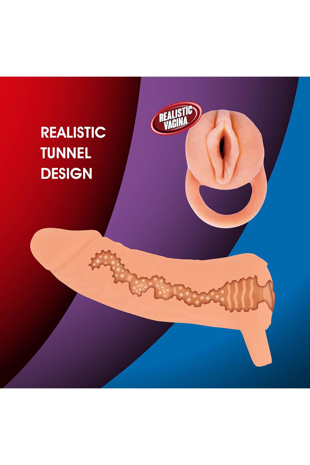 Praktická 2v1 pomôcka pre páry aj sólo: na jednej strane funguje ako hollow návlek na penis (predĺženie), ktorý pridá na objeme a dĺžke a zároveň môže pomôcť s dlhšou výdržou vďaka zníženej citlivosti. Otočením získate realistický masturbátor s vagínou – vo vnútri je tesný, textúrovaný tunel pre intenzívnejšiu stimuláciu.