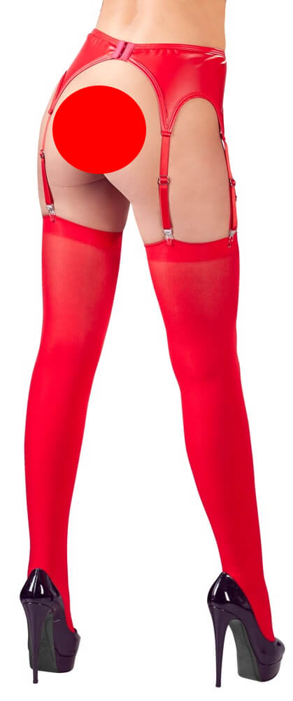 Zvodná červená súprava s podväzkovým pásom v lesklom „latex-looku“ a párom pančúch. 3+3 nastaviteľné popruhy, kovové prvky, zvodný vzhľad na pár sekúnd pripravený.