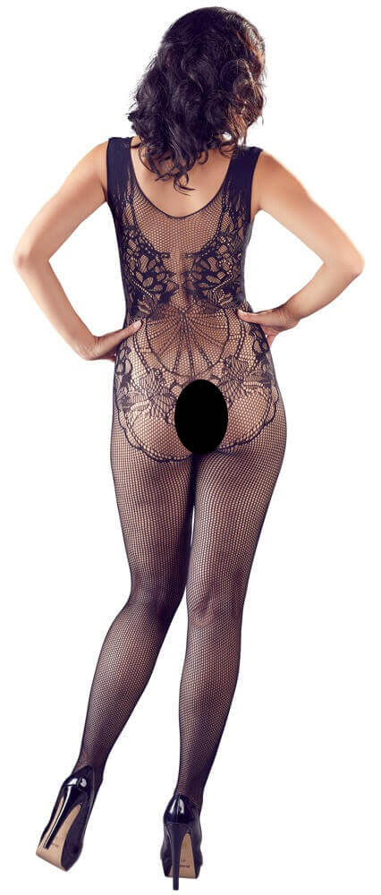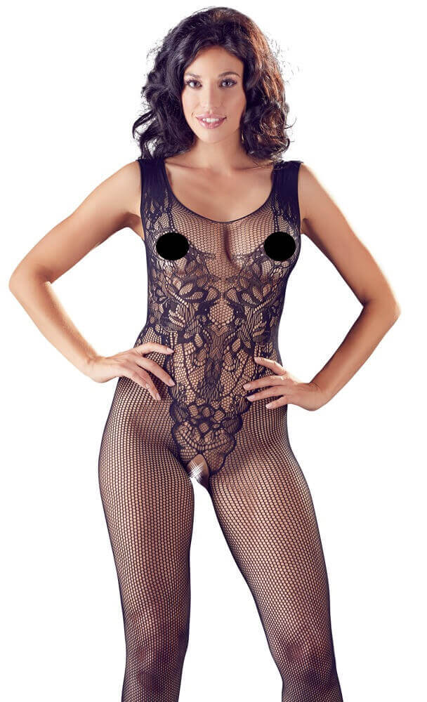 NO:XQSE – Sexi overal bez rukávov z otvorenej sieťoviny s čipkovým efektom (čierny, univerzálna veľkosť S–L)