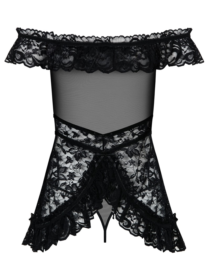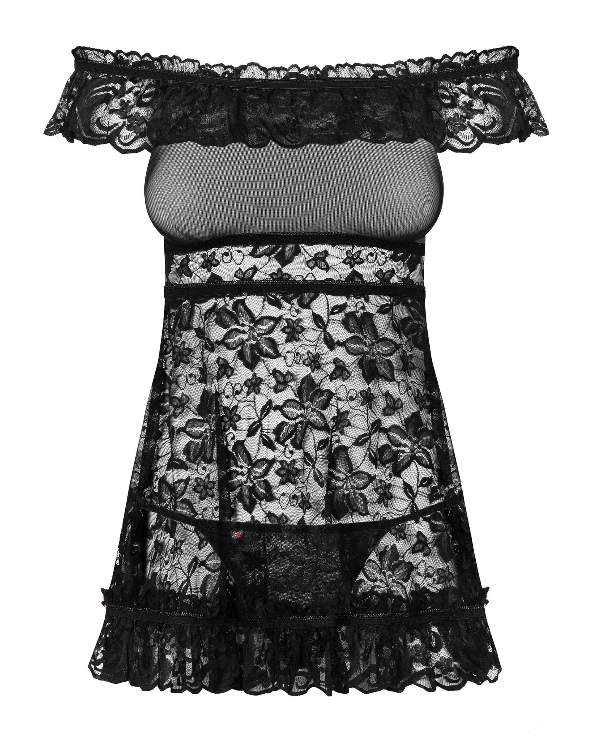 Obsessive Flores – kvetinkový babydoll s tangami, čierny Objavte ženskú a sexi stránku s babydollom Obsessive Flores. Jemne priesvitný materiál v kombinácii s romantickou čipkou krásne zvýrazní postavu, strih do A lichotí brušku a bokom. Rukávy v štýle Carmen odhaľujú ramená, zatiaľ čo extra krátky zadný diel so zaujímavým výstrihom dodá odvážny, no... Viac info