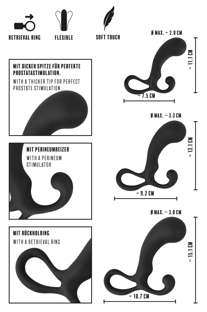 Rebel - 3-dielna sada dilda na prostatu (čierna) Úzko tvarované dildo prostaty so zvýraznenou hlavou pre intenzívne rozmaznávanie mužov a precvičovanie svalov zvierača! Vďaka špeciálnemu dizajnu a 3-dielnej sade je ideálny pre začiatočníkov aj pokročilých. Výhody : Sada 3 kusov v 3 rôznych veľkostiach pre postupnú dilatáciu a stimuláciuVďaka pevnému... Viac info