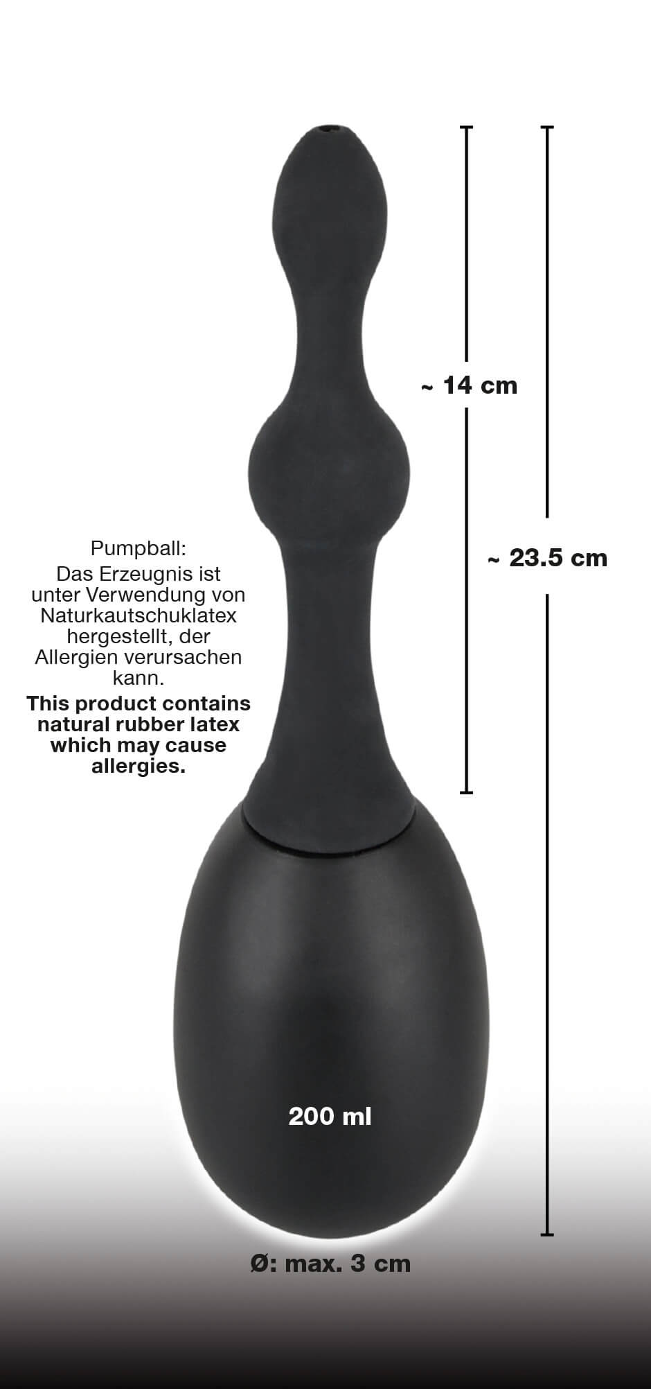 Kanyla sa vyrába z pružného silikónového materiálu hebkého na dotyk a má guličkovitý, stimulačný tvar. Pomôcka je vybavená jednoducho pumpovateľnou gumenou loptičkou. Vlastnosti: -celková dĺžka: 23,5cm -dĺžka kanyly: 14cm -priemer: 1,1-3cm -objem: 200ml -závitové pripojenie kanyly -pevná konštrukcia s jemným povrchom -jednoducho zatlačiteľná... Viac info