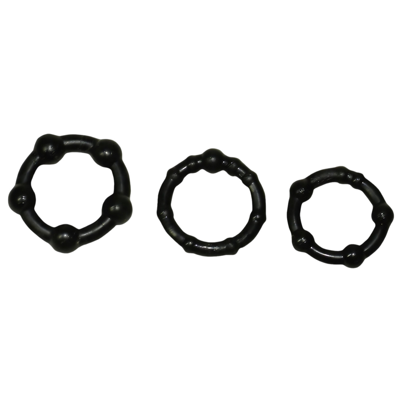 Trojitá sila pre pevnú erekciu a dlhšie milostné akty! Súprava 3 ks krúžkov na penis, s rôznymi stimulačnými guličkovitými povrchmi, ktoré hýčkajú partnerku extra rozkošou. Krúžky sa dajú požívať spolu, alebo osobitne, hoci aj ako krúžky na semenníky. Parametre :Priemer krúžkov: 2 - 2,5 cm (mimoriadne pružné).Materiál: TPE.Čierna farba. Viac info