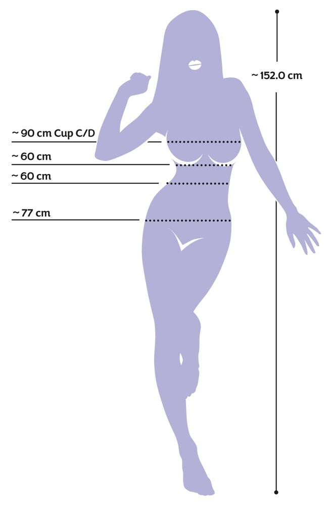 Obvody: prsia 90 cm, pás 60 cm, boky 77 cm