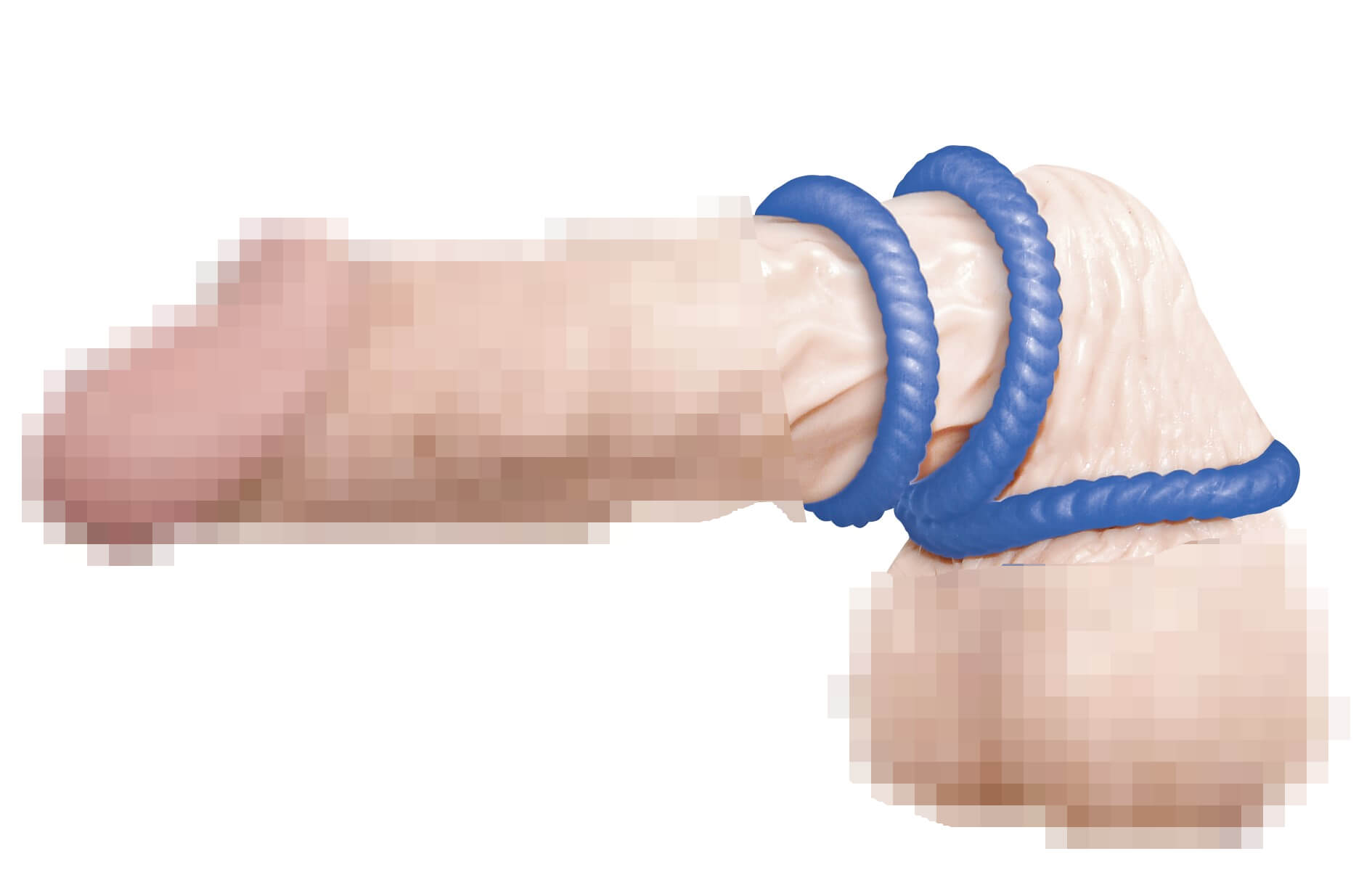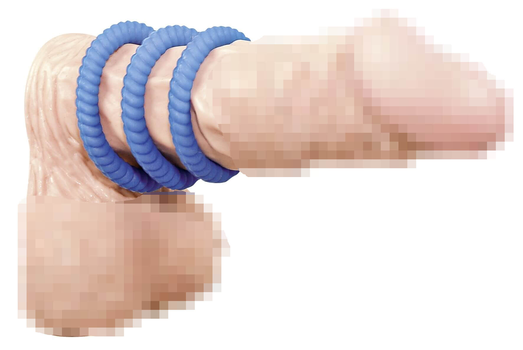 Trojdielna súprava krúžkov na penis, z odolného, silného, zároveň však aj pružného modrého silikónu.