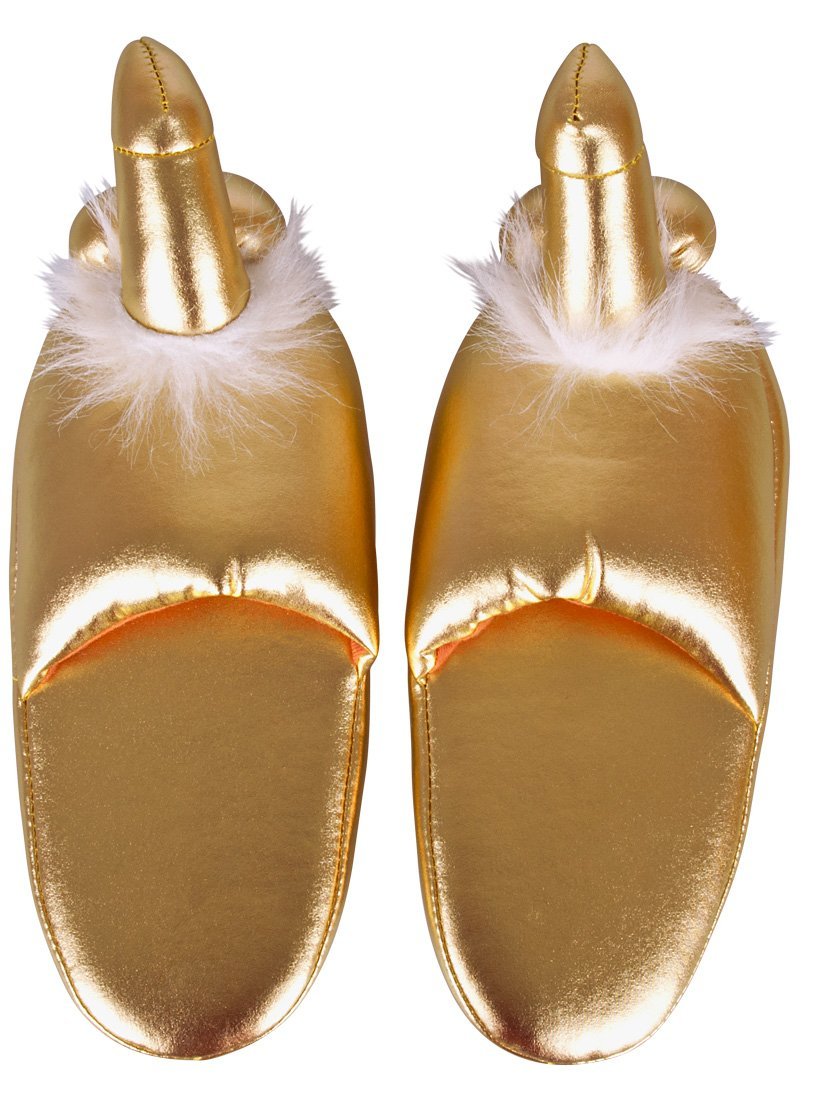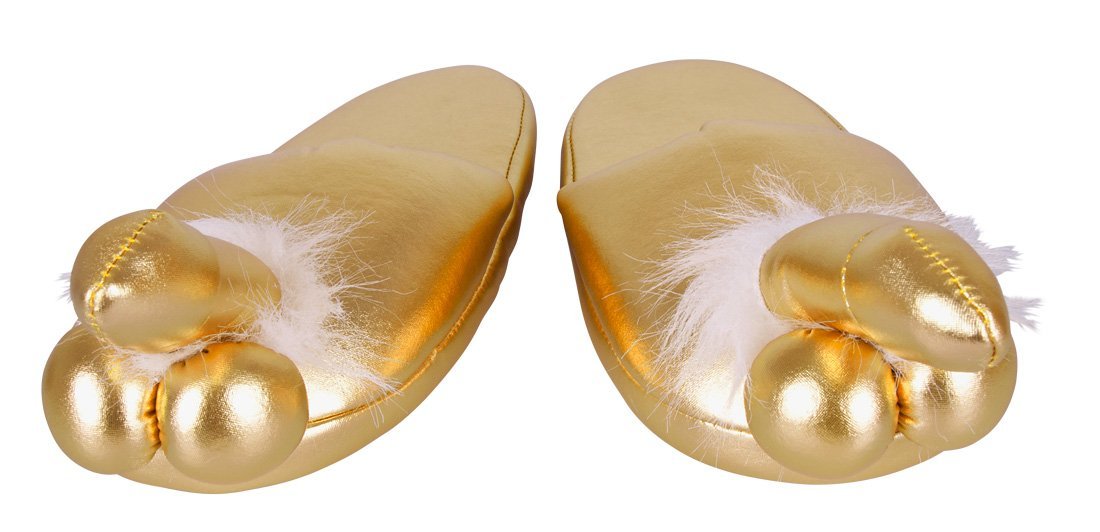 Papuče z veľmi príjemného, zlato sa lesknúceho mäkkého materiálu (1 pár), na ich vrchole sedí pekne tvarovaný, vztýčený penis s okrúhlymi semenníkmi a hodvábnymi bielymi chlpami.